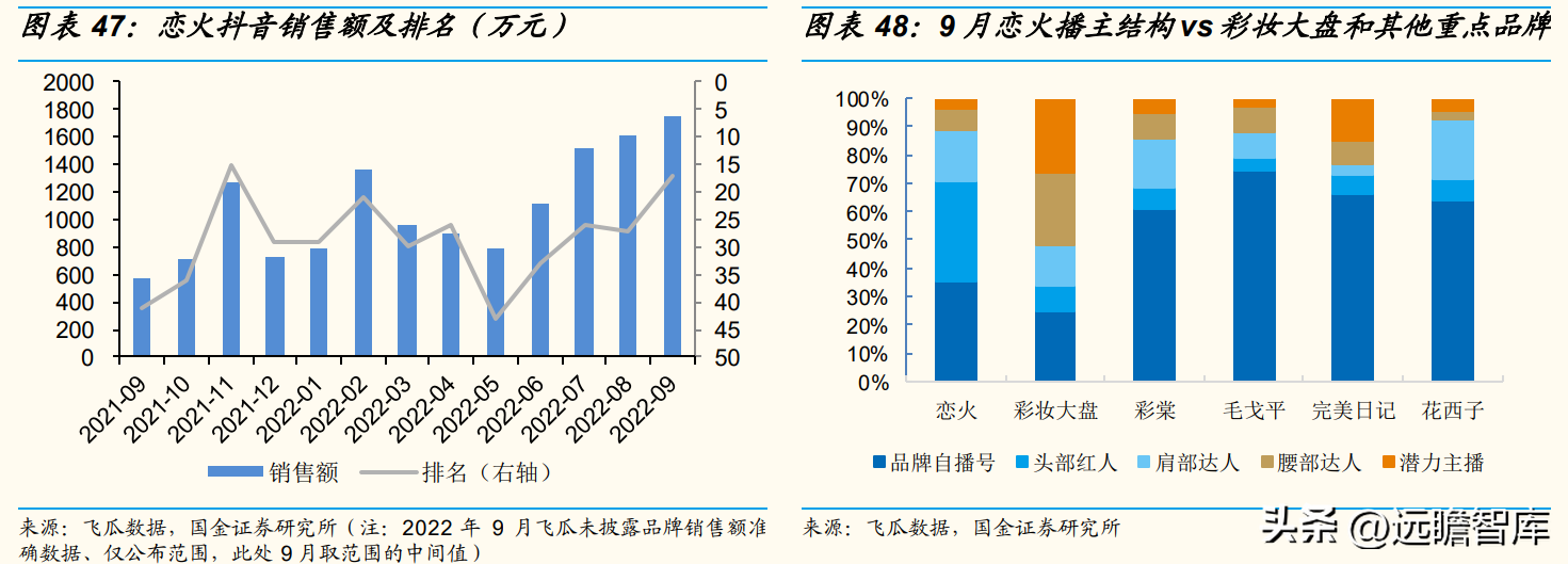 渠道结构上,恋火在京东平台的销售额较小,4Q21以来抖音发力成为第二大渠道,4Q21-3Q22淘系、抖音占比各半。