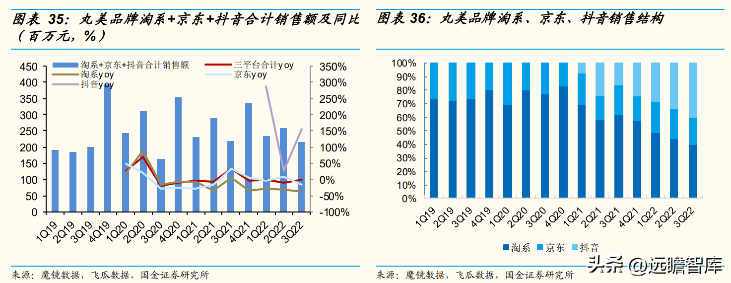 2021下半年以来,抖音起量、线上平台呈现多元化,根据魔镜和飞瓜数据,抖音GMV占淘系+京东+抖音的比从2021年1月的5%提升至2021年12月的15%,2022年9月进一步提升至26%。