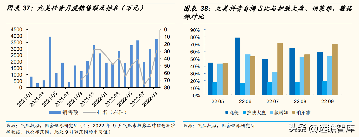 据魔镜和飞瓜数据,1-3Q22各季度丸美品牌淘系+京东+抖音三平台合计销售额分别同比+1%/-10%/-2%,略输大盘同比增速+2%/-0.4%/-1%,主要为淘系承压,但抖音增长较快、3Q22规模超过淘系。1-3Q22各季度品牌抖音销售额分别同增287%/26%/155%,同期抖音美妆大盘增263%/185%/83%,3Q22抖音大盘增速有所放缓、丸美品牌增长提速、跑赢行业。1-3Q22抖音大盘增146%,丸美增99%。