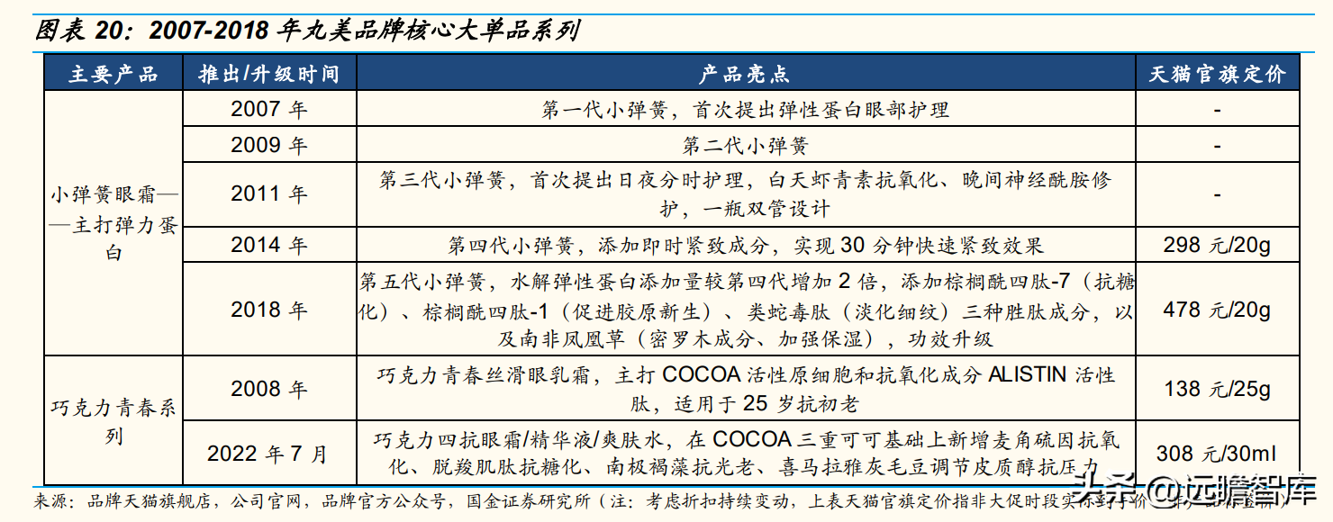 从主要大单品价格带看,公司已经形成相对清晰的产品体系,其中小紫弹、巧克力青春系列在200元左右、主要面向20岁-30岁年轻客群抗初老、线上为引流产品;蝴蝶眼膜、弹力蛋白系列、小红笔在300-400元、为主力产品,历史久、核心的第五代小弹簧眼霜为价格带相对较高的产品、单价500元左右,主要面向30岁以上成熟女性抗衰需求(购买力相对较高)。