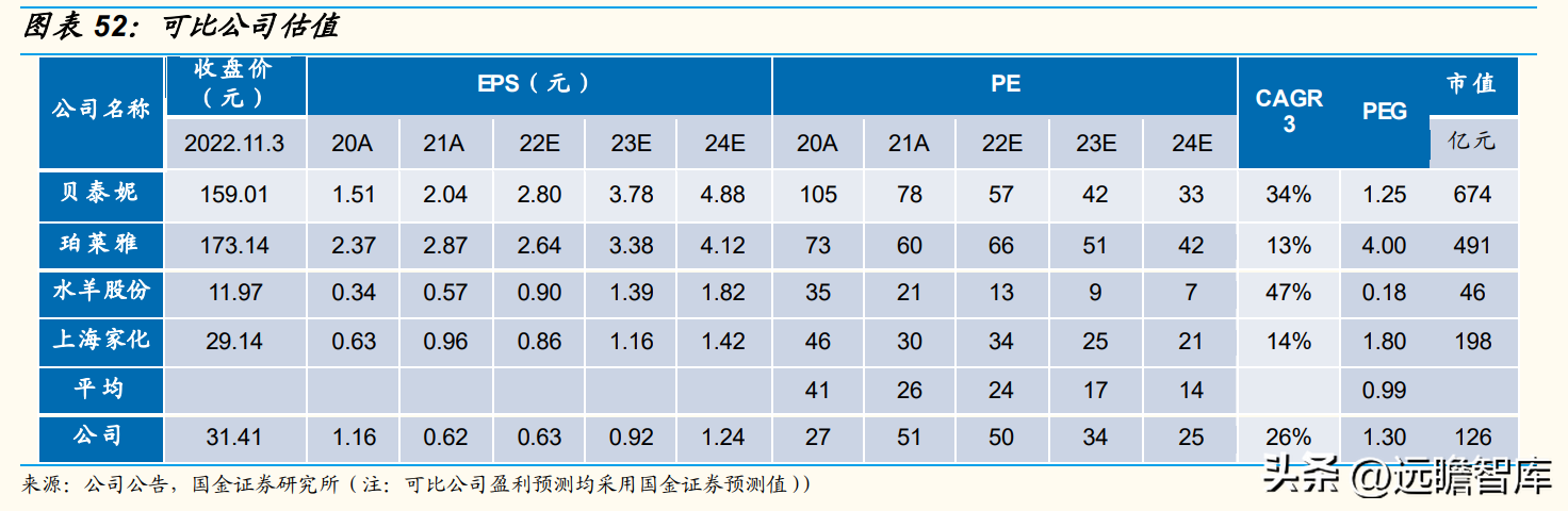 我们选取A股美妆品牌商贝泰妮、珀莱雅、水羊股份、上海家化为可比公司,2023年可比公司平均估值17倍,其中龙头贝泰妮、珀莱雅分别为42倍/52倍、显著高于水羊股份和上海家化,具备差异化的美妆龙头享受估值溢价。