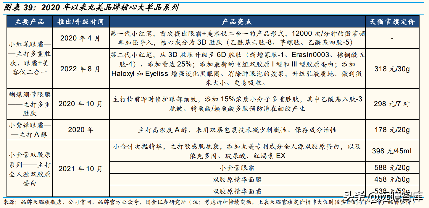 1)天猫大单品占比提升,近年孵化的小红笔/小紫弹/小金管/蝴蝶绷带眼膜等新品成主力产品,货盘结构健康向上;