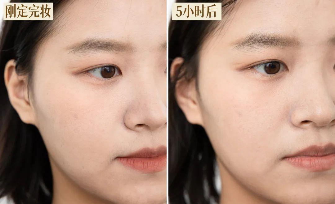 除了爱出油的鼻翼脱妆积粉,斑点比刚定完妆要一点,其余妆面完整度保持得很好。