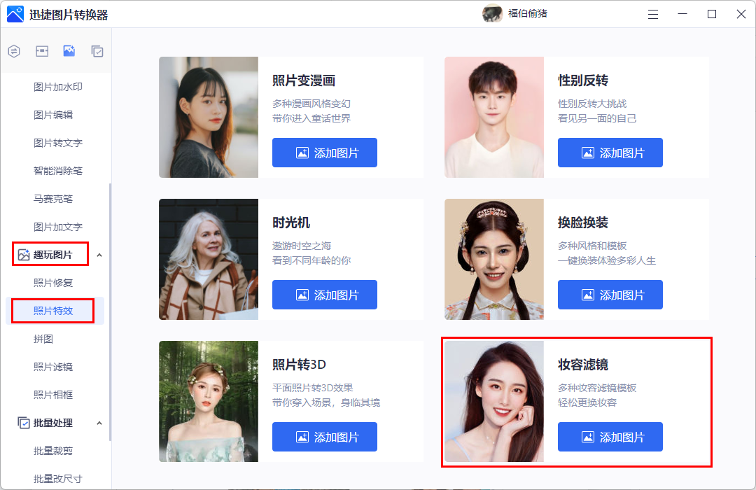 步骤一:同样我们在【趣玩图片】里面找到【照片特】,然后选择【妆容滤镜】;