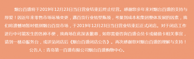 大小新闻客户端11月16日讯(记者 刘海玲)近日,烟台百盛购物中心在商场显著位置张贴公告,并通过媒体对外发布,将于12月23日租赁合同自然到期后闭店,百盛也因此成为市民和媒体关注的焦点。