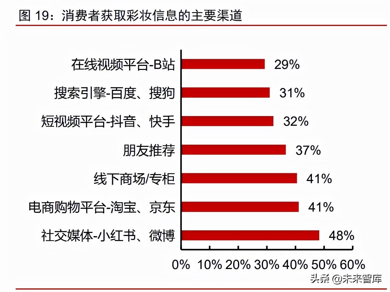 线上投放费用高,渠道多元化。美妆市场规模整体呈现稳定扩容状态,营销费用投放 也增势。社交 媒体为年轻消费者获取彩妆信息的主要渠道,从小红书和微博、抖音和快手获取彩妆信息 的消费者占到 48.3%/32.3%。2020H2 彩妆/护肤在抖音短视频热销商品数量中占比 8% /12%,在抖音热门带货达人主营类目中占比 17%/19%。根据 QuestMobile 数据,2021Q1 美妆护理行业互联网广告投放费用同比增长超过 。短视频是美妆热衷投放的主要渠 道,2021 年美妆品牌在抖音/小红书投放多,分别占比 44%/29%,其次为微信公众号/ 微博,分别占比 9%/3%。