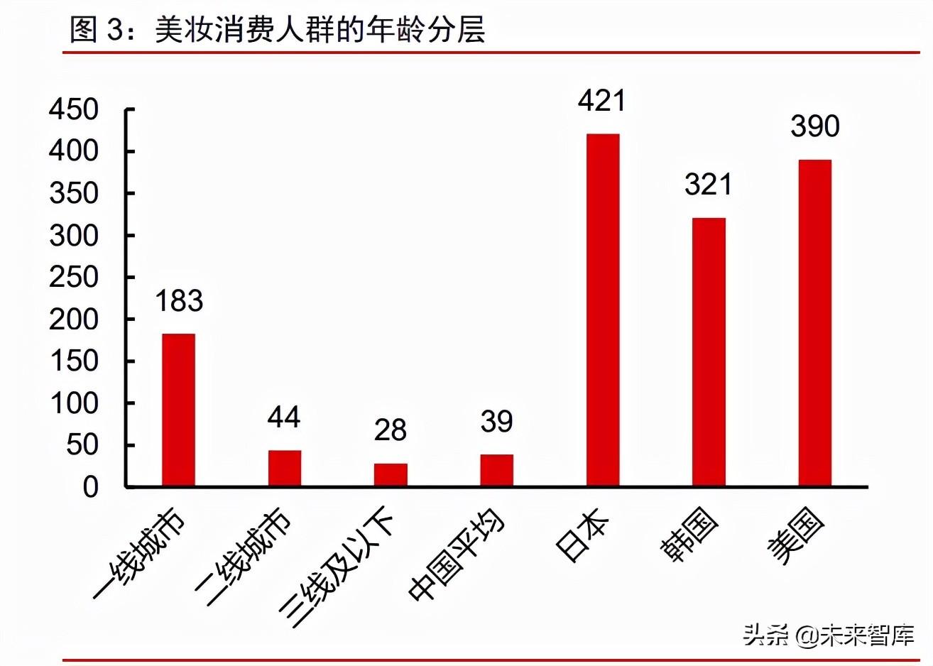 随着收入水平提升,同时社媒崛起使得彩妆消费者教育普及,彩妆消费越发普遍化、 渗透率不断提升。2015 年至 2019 年,彩妆渗透率从 31.6%大幅提升至 48.8%,彩妆消费 人群不断扩容。对比日美,中国人均彩妆消费具有的提升空间。2019 年,我国 人均彩妆产品消费金额为 39 元,远低于日本/韩国/美国的 421/321/390 元,仅为其人均消 费额的 1/10 左右。我国一线城市的人均彩妆消费额为 183 元,远超二线及以下城市,但 仍不及欧美、日韩等国的 1/2。