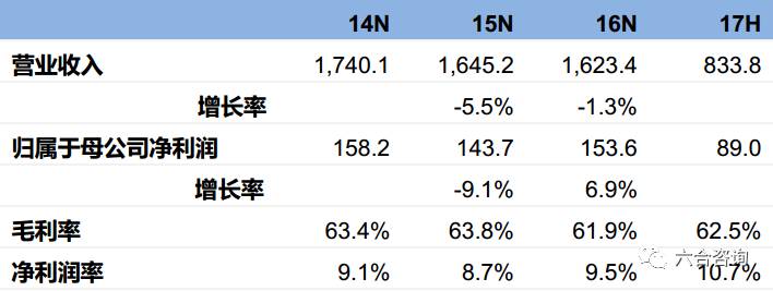 总收入:2014~2016年、2017上半年分别为17.4 亿、16.4亿(-5.5%)、16.2亿(-1.3%)、8.3亿。公司收入有所下降,主要受国内宏观经济增长放缓影响。