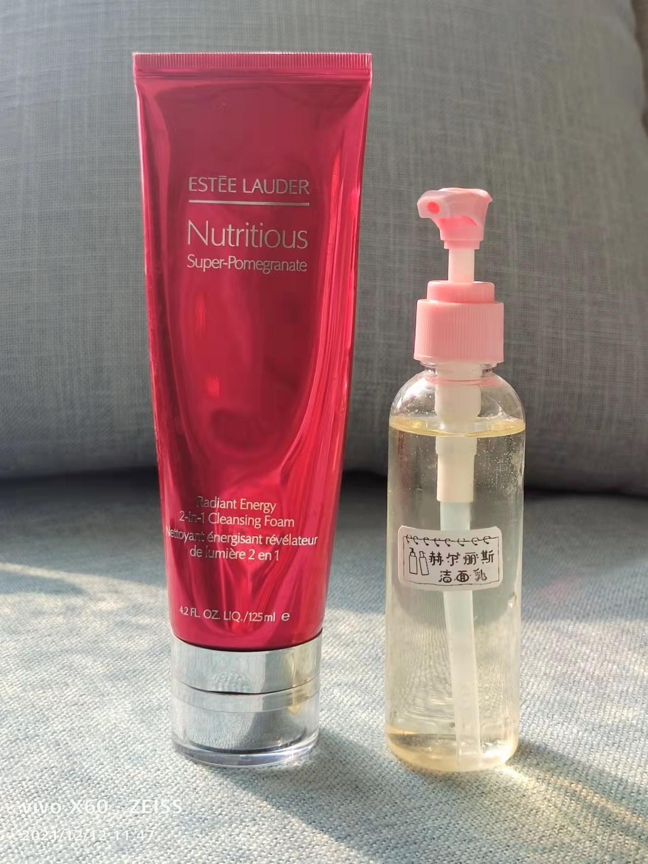 护肤第一步就是洁面,我用的洁面产品是雅诗兰黛红石榴洁面乳和赫丽尔斯氨基酸洁颜蜜。