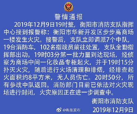 据湖南省衡阳市消防救援支队官方微博通报,2019年12月9日19时整,衡阳市消防支队指挥中心接到报警称:衡阳市华新开发区步步高商场一楼发生火灾。接警后,支队立即调派7个中队,19台消防车,102名指战员前往处置,支队全勤指挥部出动。19时03分第一批力量到达现场,经侦察为商场中间一化妆品专柜起火,并于19时15分扑灭火灾,随后进行火场清理和排烟,经排查起火面积约8平方米,无人员伤亡。20时50分,所有参战中队返回,消防支队对华新步步高商场进行临时查封,火灾原因正在调查之中。