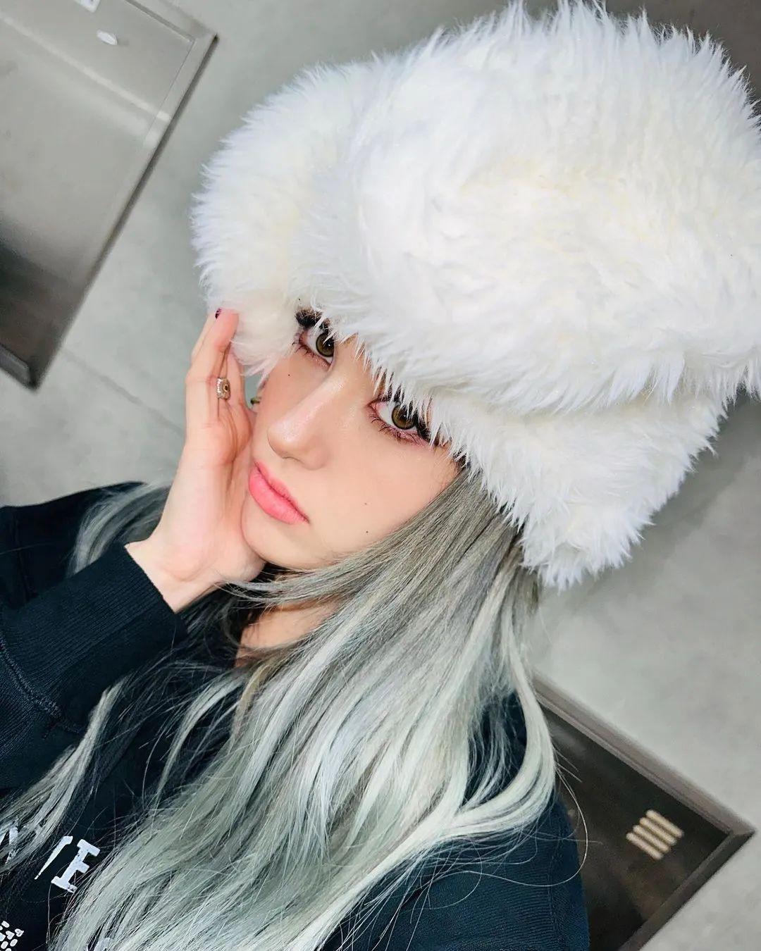 Twice 彩瑛在英单预告照就带了一顶黑色的毛绒帽,搭配黑丝手套和白金发色,吸睛。