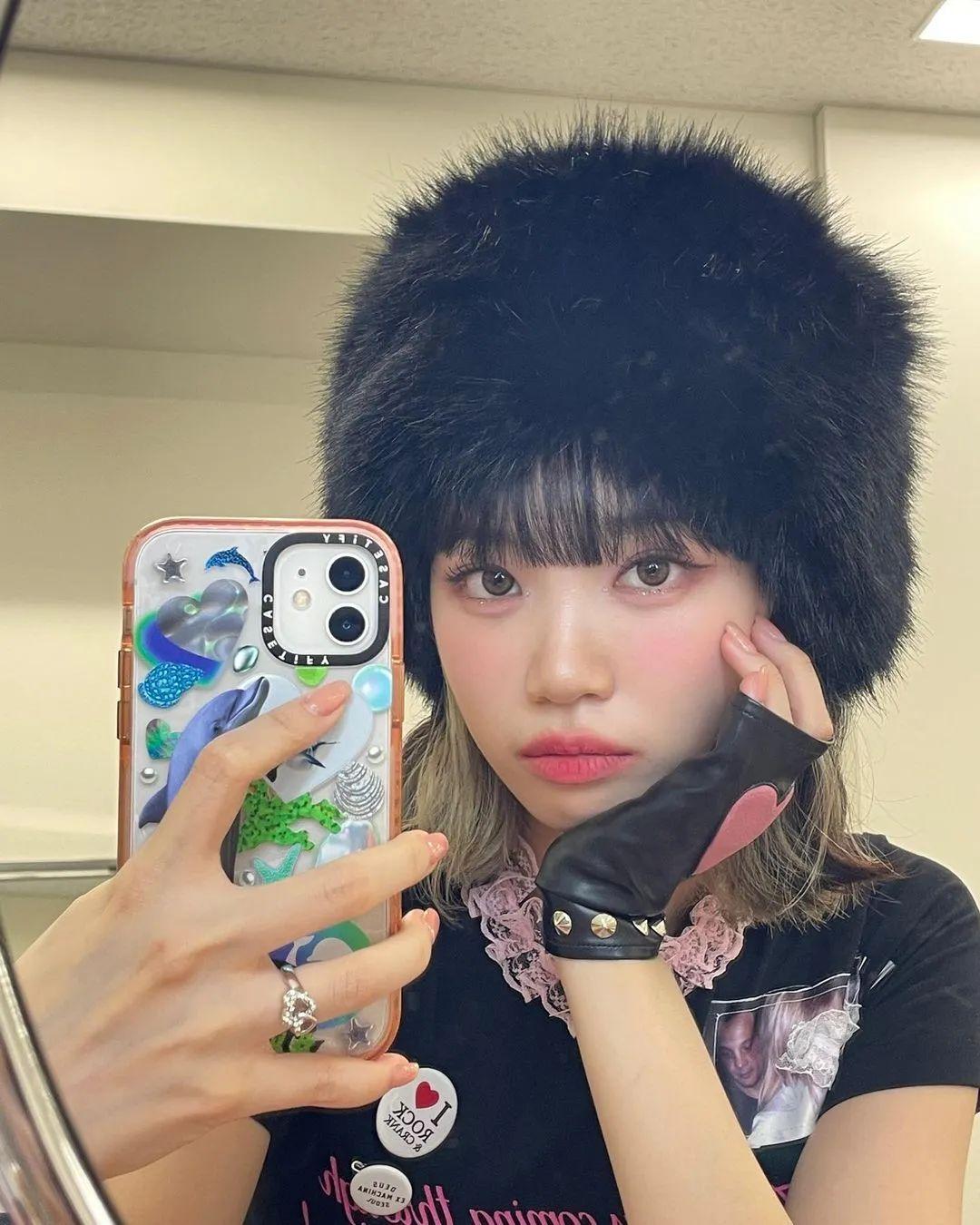 Itzy 黄礼志在《Cheshire》新歌的造型也选择了一顶豹纹的毛绒帽,搭配齐刘海和小猫眼,野性又性感。