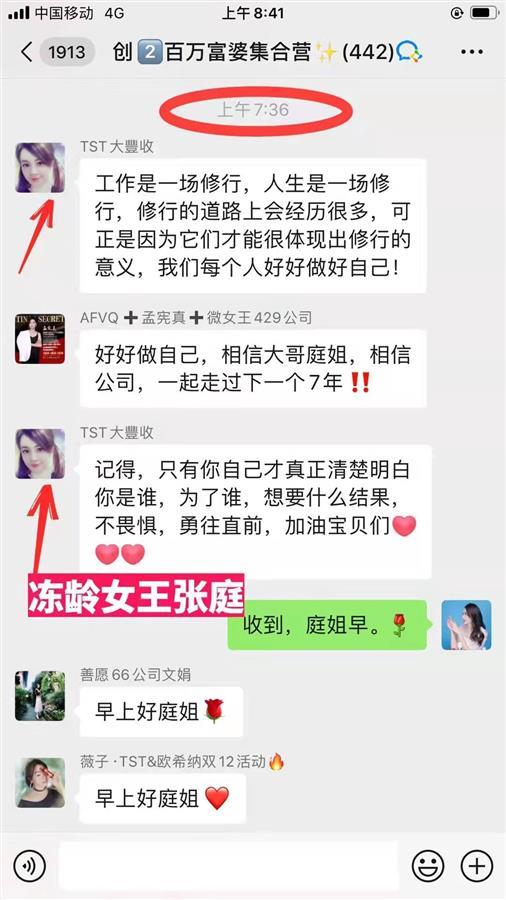 此前,接受极目新闻采访的石家庄代理商小萌(化名)则告诉极目新闻记者,自己在朋友圈看到有其他代理放出截图,疑似张庭在群聊中为代理商打气。