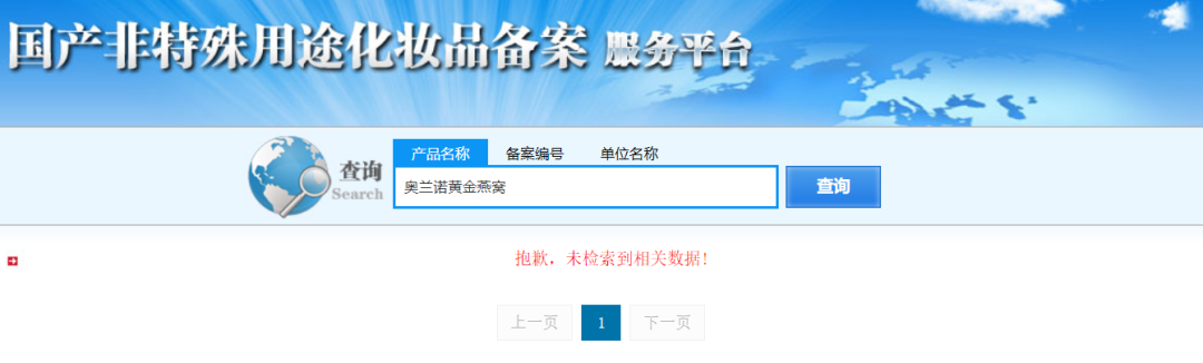 奥兰诺品牌天猫旗舰店内,在售燕窝产品只有一款“黄金燕窝保湿补水护肤礼盒”,但在药监局化妆品备案系统中,没有该产品的任何备案信息,涉嫌未备案先上市。