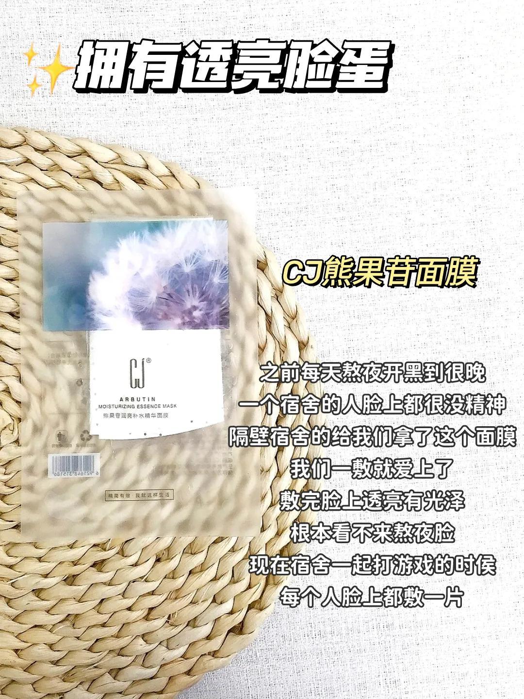 那个CJ熊果苷的面膜我都炫好几盒了,现在我妈跟着我一起用,脸上素颜都可白,省的化妆了!