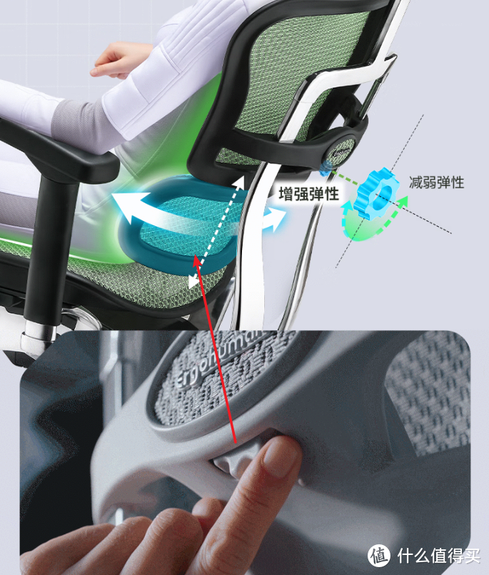 这里说一下网面的坐垫,也是现在主流的,分高回弹和低弹两种网布,这里建议大体重人群选择低弹网布(软硬适中),支撑性会好一点;高回弹比较软,大体重人群坐了容易陷进去。