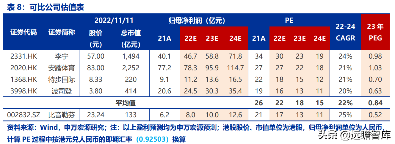 综合考虑品牌价值、所处赛道、成长性等因素,我们选取李宁、安踏体育、特步国际、波司登 4 家作为可比公司。上述 4 家公司均为国货领军品牌,享有较高国民美誉度,正处于良好发展势头中。同理,比音勒芬作为高端国货运动标杆品牌,品牌价值巨大,且同处于高景气运动及功能性服饰赛道,具有极高成长上限,与该 4 家公司存在一定的可比性。比音勒芬作为中国高端运动品牌,长期受益于国货崛起与运动赛道高景气。
