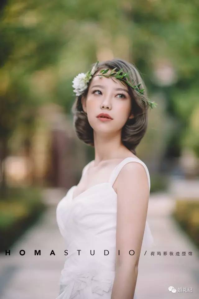 俏皮的短发造型,发尾打造内扣卷翘,搭配清新的绿植花环,清新亮丽的眼妆,腮红和唇色相呼应。