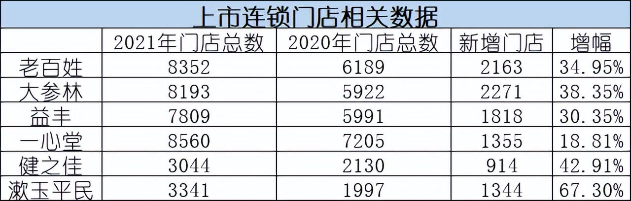 2021年,老百姓、大参林、一心堂门店都超过8000家,而老百姓、大参林、益丰门店增速在34%以上;新上市的健之佳、漱玉平民门店增速更是惊人,其中漱玉平民门店增速超过67%。