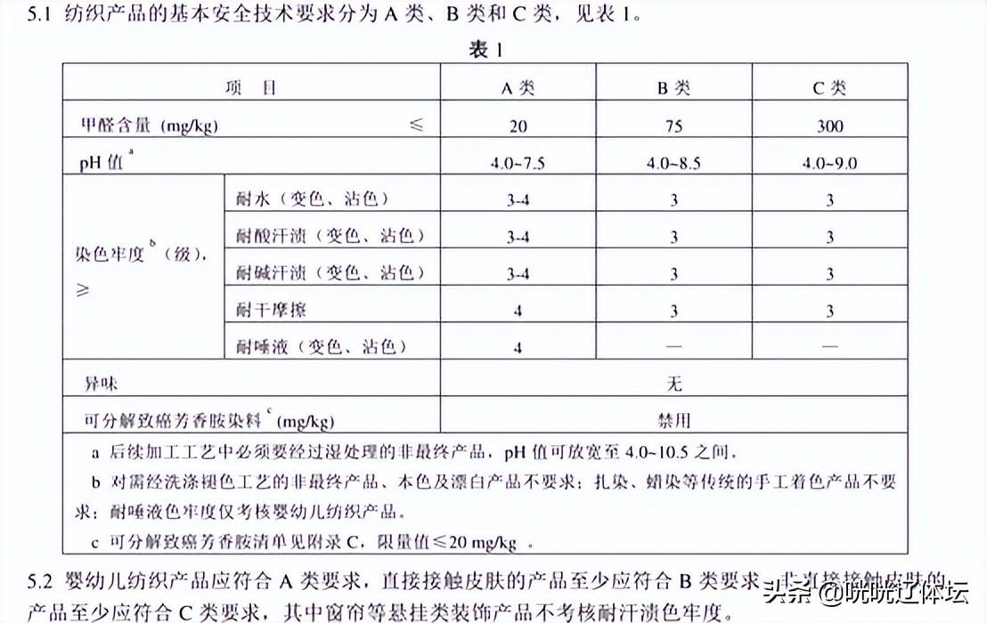 根据《纺织产品基本技术规范》划分,服装被划分为A、B、C类三个级别,即婴幼儿用品应当符合A类产品的技术要求;直接接触皮肤的服装应符合B类产品的技术要求;非直接接触皮肤的服装应符合C类产品技术要求。