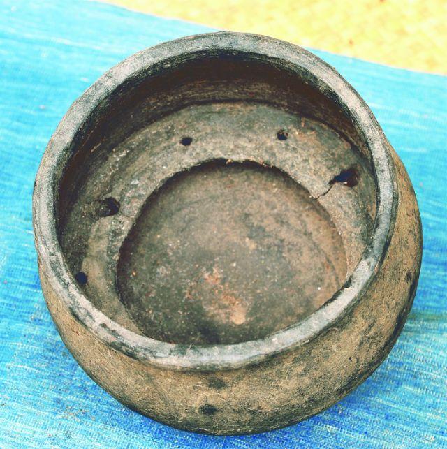 在村外空旷的田野中央,放上四块石头,上面搭上木柴架,铺以竹木。然后把陶坯倒扣着码放在柴堆上,再盖上一层厚厚的干稻草。同时,把一个烧制好、完好无损的陶器作为引子放在上面,希望这批烧制出来的陶器也一样无缺。