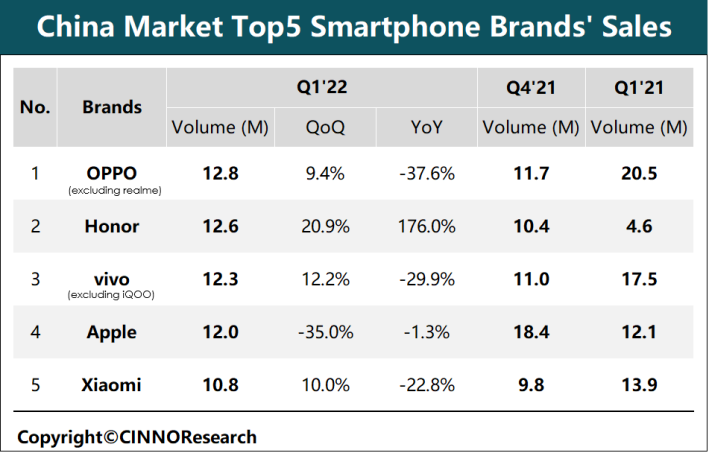 第三方调研机构CINNO Research发布的数据显示,2022年第一季度,中国大陆市场智能手机销量约为7439万部,较去年同期下滑14.4%,前五大品牌中有四个同比均出现下滑。