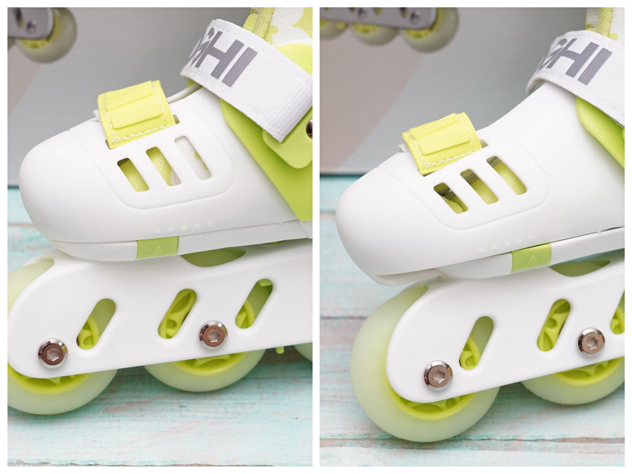 酷骑R2小童轮滑鞋配置了两种大小的高品质PU轮,分别是62mm和60mm的,通过轮架孔位高低不同的特殊设计,可以巧妙切换平花或者休闲模式,这比普通刀架需要专门购买不同大小的轮子更为人性化。