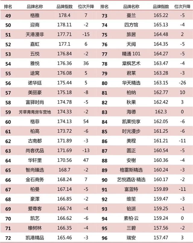 榜单内共计79家全服务中档酒店品牌和214家有限服务中档酒店品牌。品牌影响力上,55.29%的品牌较上月环比上涨;分别来看,55.70%的全服务中档酒店品牌环比上涨,55.14%的有限服务中档酒店品牌环比上涨。品牌排名上,37.88%的品牌环比上升;分别来看,31.65%的全服务中档酒店品牌环比上升,40.19%的有限服务中档酒店品牌环比上升。具体榜单如下: