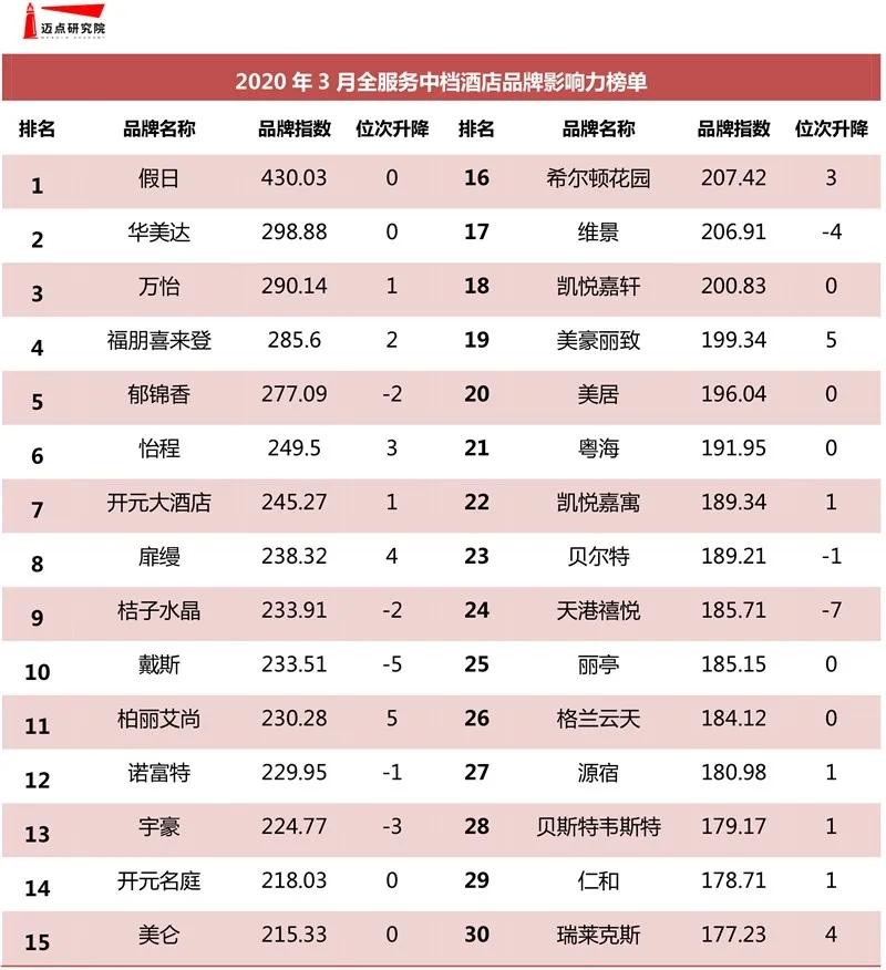 本月迈点研究院新发布的“2020年3月中国住宿业全服务中档/有限服务中档酒店品牌影响力榜单”中,假日、华美达、万怡、福朋喜来登、郁锦香、怡程、开元大酒店、扉缦、桔子水晶和戴斯成为全服务中档酒店品牌TOP10;有限服务中档酒店品牌前十名则分别是维也纳、麗枫、全季、亚朵、锦江都城、美豪、和颐、书香世家、白玉兰和潮漫。
