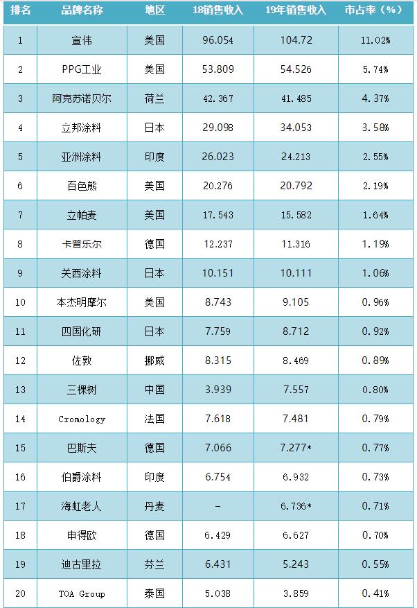 根据涂界监测的数据显示,2019年涂料总产量约9660万吨,销售收入约1977亿美元,其中:2019年建筑/装饰涂料产量为5313万吨,年销售收入为950亿美元。装饰涂料品牌20强去年累计销售收入为394.796亿美元,占建筑涂料比例为41.56%。