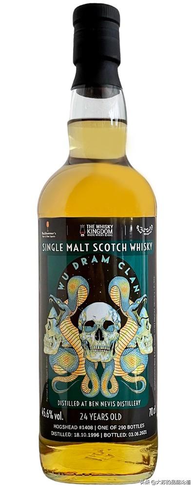 由本尼维斯为德国烈酒爱好者Wu Dram Clan三人组官方装瓶,蒸馏于1996年,熟成于猪头桶,桶号1408,酒龄24年,酒精度45.6%ABV,装瓶291瓶。具有浓郁的成熟果香,充满异国情调,比如菠萝,番石榴,酸橙,芒果。荔枝,还有奶油糕点、野花、蜡烛和皮革的味道。很直接,也很性感。口感是的果篮,充满菠萝、粉红柚子、番石榴、芒果,并带有一丝西番莲水果的味道。还有石蜡,花蜜和马鞭草的味道。背景中有一些白垩/矿物的味道。回味悠长,略带绿色和薄荷醇的味道,但仍有大量这些甘美的热带水果。