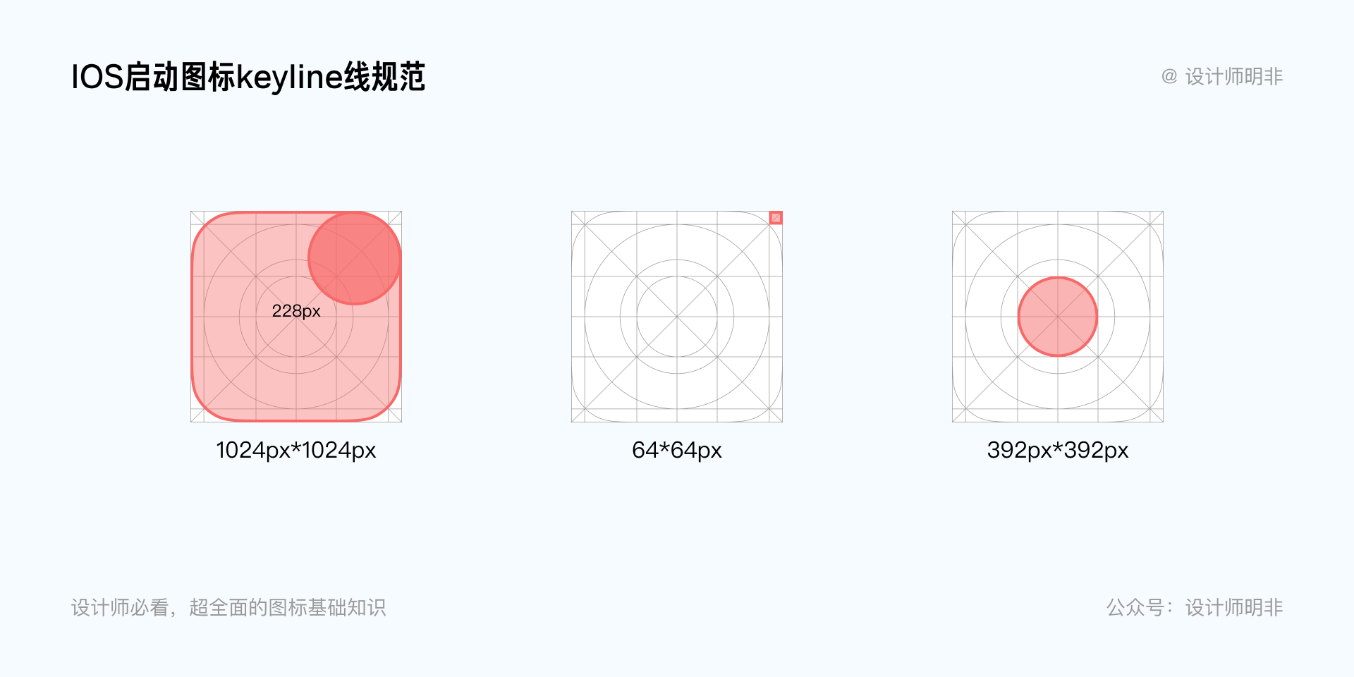 这里提醒一下,虽然我们看见的iOS的图标是个圆角矩形,但是机上它并不是标准的圆角矩形,而是某种连续曲线。但我们很难肉眼地看出区别,因此并不用纠结它的圆角,按照直角矩形的尺寸进行绘制就好。