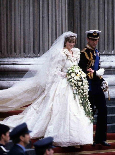 戴安娜王妃在婚礼上身着一件梦幻的象牙色真丝塔夫绸拖地长裙婚纱, 由David和Elizabeth Emanuel设计,婚纱上有一万颗珍珠和皇室婚礼历史上长的25英尺长的拖尾。