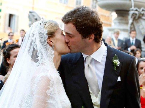 Elisabetta(又名Lili)穿着带有精致的花边领和薄纱七分袖的Valentino婚纱。而吸引目光的还有她精致的蕾丝头纱。