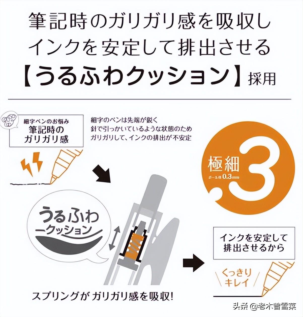 提供0.3mm的超细笔头,并且搭载了斑马的Uruwafuwa减震弹簧,根据使用者书写力度的不同,自动适配合适的减震果,保障书写的稳定性,在颜色方面的可选领域也广,是一款相当好用的彩色中性笔。