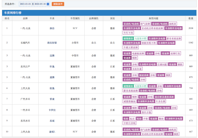 口碑及销量的坍塌值得一提的是,受颗粒捕捉器堵塞影响,自2021年2月份开始,探岳连续7个月霸占第三方平台车型投诉量排行榜榜首;2021年至今,探岳毫无意外的高居投诉排行榜榜首,投诉量高达2058条。