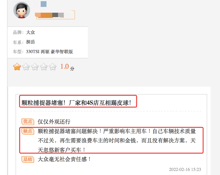 由此可见,颗粒捕捉器堵塞问题已经影响到了探岳及一汽-大众的口碑及销量。