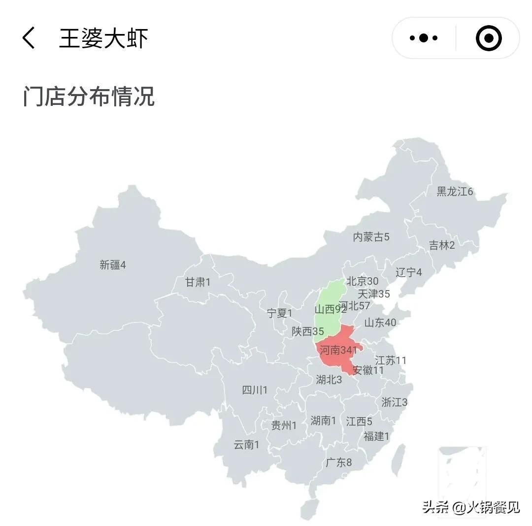 而诸如门店数量排名第四的王婆大虾,深耕河南、山西等省市,只在河南省就有341家门店,分布在郑州、平顶山、洛阳等地市县等。