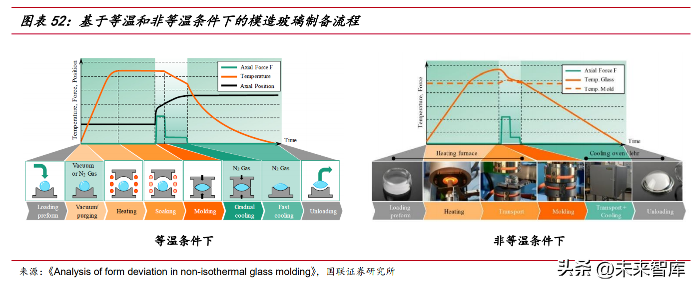 模造成型工艺是制备玻璃镜头的主流工艺,技术壁垒高。模造成型工艺技术发 展较为成熟,是当前行业内制备玻璃镜头的主流工艺,该方法的基本原理是将预加工 的玻璃胚胎放置于精密成型模具中,加热升温使玻璃软化,再向模具表面加压使玻璃 成型。模具的设计与加工是该方法的核心,技术和工艺的壁垒较高,模具的精度将会 直接影响玻璃镜头的生产良率与光学性能。