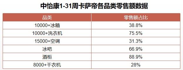 就拿卡萨帝来说,连续6年稳居高端第一后,卡萨帝又换道场景,深度融合三翼鸟,打开了新的增长空间。中怡康数据显示,今年1-31周,卡萨帝在多个高端品类占据第一。其中,1W+冰箱市场零售额份额为38.8%,1W+洗衣机市场零售额份额为75.5%,1.5W+空调市场零售额份额为31.3%,冰吧、酒柜、8000+干衣机也都是第一,零售额份额分别为66.9%、88.9%、28%。