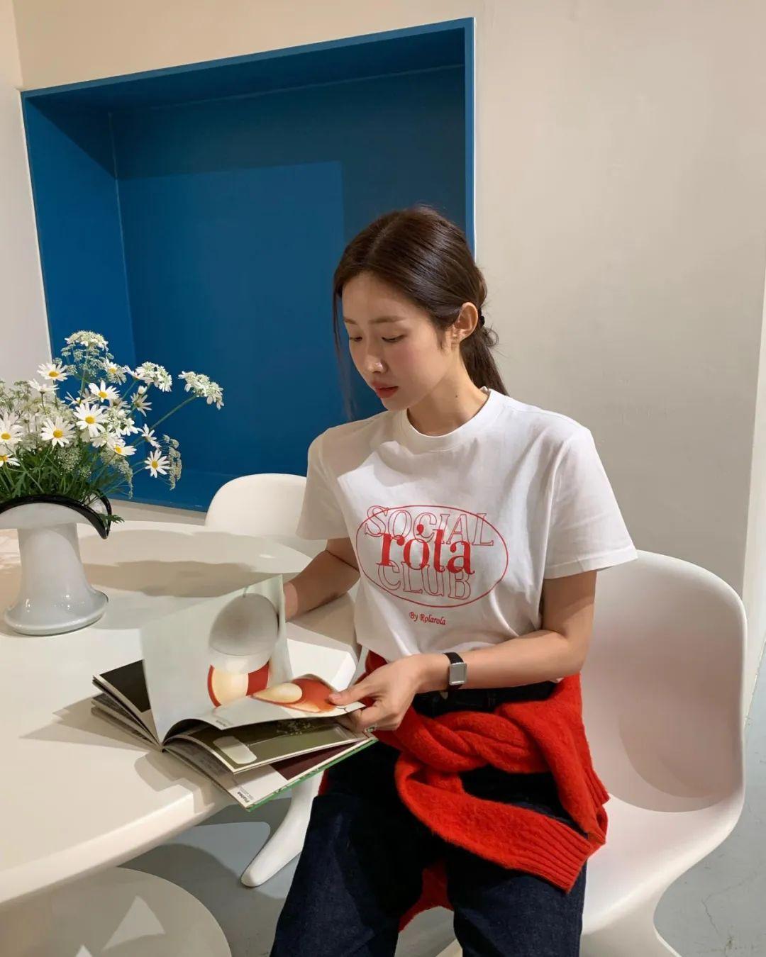 靠好衣品出圈的韩国演员车静媛,穿过他家一件红色字母图案T恤,国内电商参考价230元▼