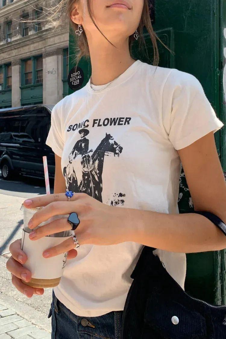 要说到白底印花T恤,就不得不提RE/DONE了,它走的是美式街头风,牛仔裤受欢迎。T恤也蛮多女明星pick的。