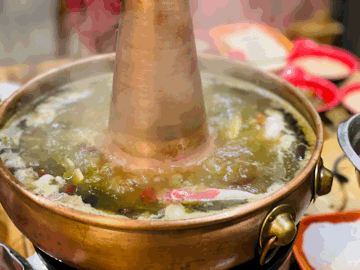 鲜刨羊肉卷必不可少,衔一筷子羊肉卷下去,红白相间的羊肉在汤里翻滚,肉片慢慢褪色,白色肥厚起来,红色成为淡褐色,刚刚成熟就赶紧用筷子叨起来,在锅的上方上下挥几次,肉凉到恰到好处,放进嘴里,一股子羊肉鲜香迅速充斥口腔,随着咀嚼,肉汤被挤压出来,肥美的羊肉味道也越来越丰富。