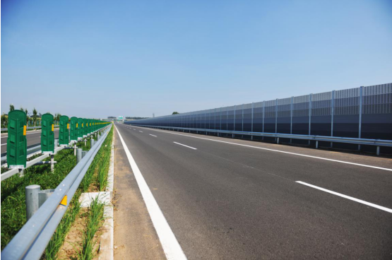 “我们09标段有7处近2100米声屏障的布设。声屏障的作用主要是阻挡路面行车产生的噪音,你看这上面的是隔声板、下面的是吸声板,为的就是给沿线村庄创造良好的环境。”09标工程部长刘伟鹏告诉我们,声屏障共3.5米高、8厘米厚、每组2米长,由7块轻质高强水泥吸声板通过卯榫拼接,再通过立柱、预埋螺栓、地梁固定在4米深的钻孔桩基础上,整套声屏障用钢筋从下到上连接,抗风度好、性高。“声屏障是品质工程‘五线一面’的其中‘一线’,为声屏障的平顺度和直顺度,首先预埋件定位就要准确,整个线型才有。”刘伟鹏介绍,一般的附属工程用水准仪测量就可以,但声屏障要用全站仪进行定位,放线的角度、位置、坐标,高程控制、中心偏位控制达到设计标准。此外,针对特殊位置产生的5毫米以下的偏差,他们还会使用环氧砂浆调整立柱角度,线型优美。