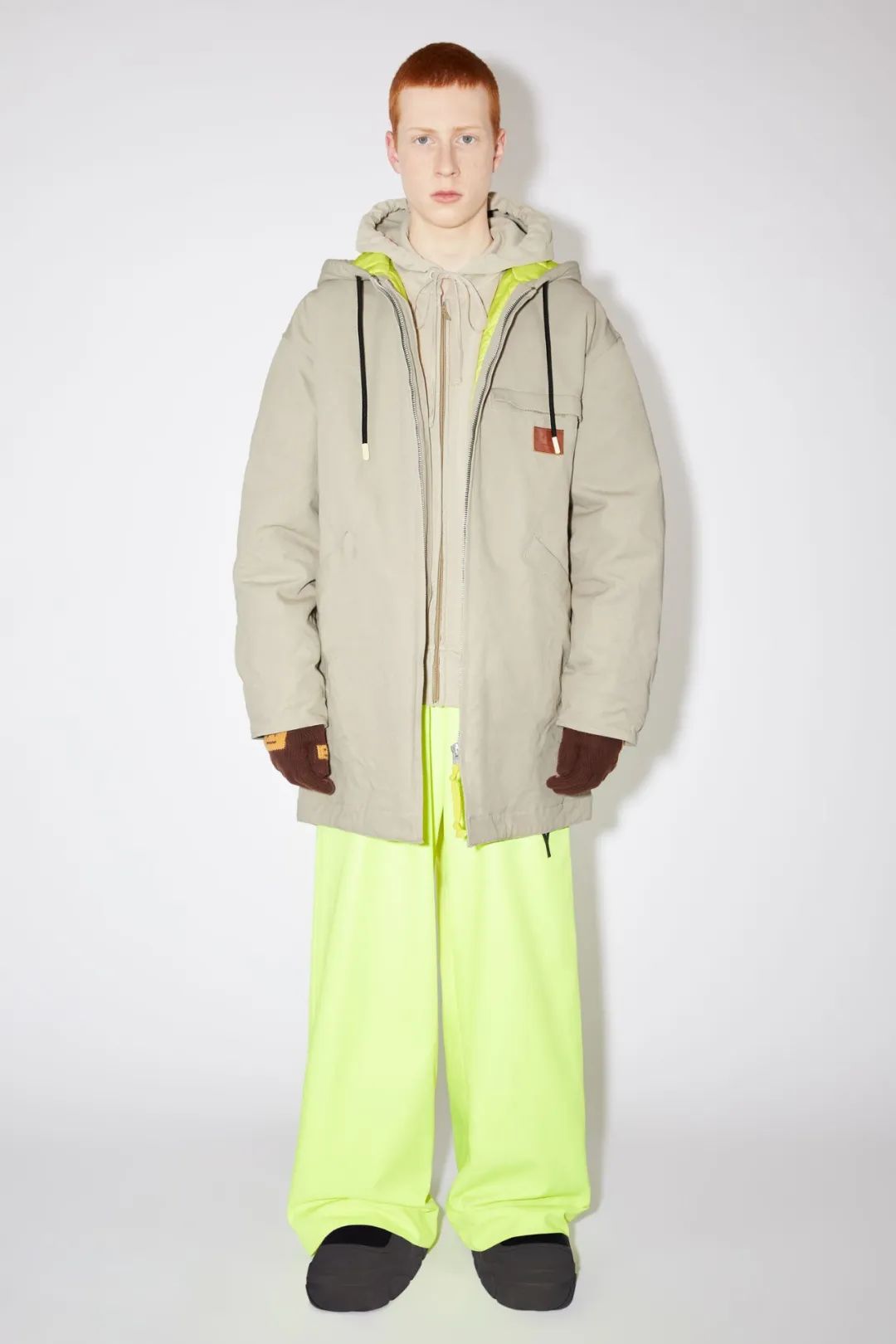 或者一件蘑菇米色的棉质派克大衣,内搭同色系的连帽衫,将叠穿的层次感凸显,下身一条抓绒运动裤,玩一个上下身质感对比,或者混纺长裤,来个有头有尾,大衣的重量感让犬系的乖巧更加。