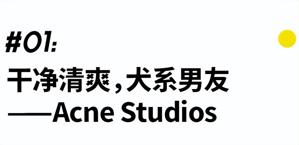 但穿搭Acne Studios家的服装要注意,Acne Studios穿搭风格偏向大道至简,有服装本身的搭配碰撞就足以出彩,如果加入一些项链等首饰,反倒破坏了本身的清爽感,奶狗容易变成街头小混混。