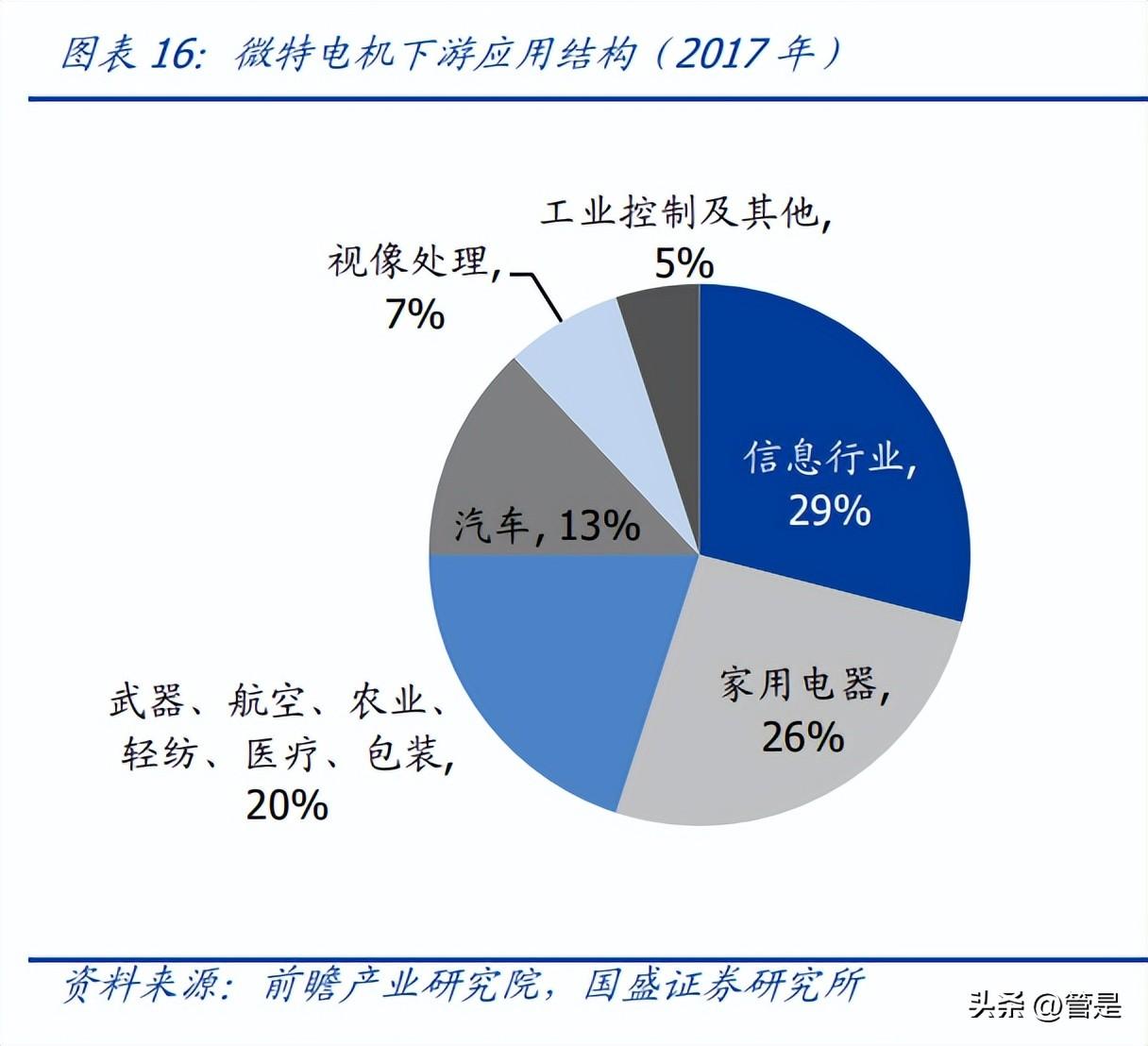 国内市场规模逾 2000 亿元,新兴领域应用为未来主要增长点。随着智能化、自动化、 信息化大潮在生产、生活各个领域的推进,我国微特电机市场规模持续快速增长。根据 华经产业研究院统计,2020 年我国微特电机市场规模为 2423 亿元,同比增长 7.1%, 2014-2021 年 CAGR 达 13.1%。从下游应用来看,微特电机的传统应用行业如信息行业、 家用电器等占比较高,2017 年比例分别为 29%、26%。随着传统应用领域市场逐渐饱 和,微特电机的主要增长动力将切换为新能源汽车、工业控制等领域。同时,微特电机 将进一步向小型轻量化、高率化、大转矩、低振动、低噪声、高可靠性、低价格、长 寿命等方向发展,有望扩大需求端应用场景,在机器人、无人机、可穿戴设备、智能家 居等新兴领域快速放量。