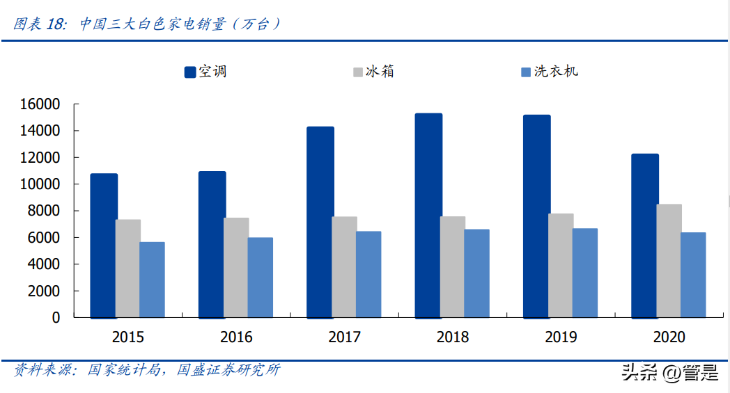 政策红利热度逐步退却,家电领域进入存量更新加速阶段。我国 2009 年的“家电下乡” 政策曾带来一轮家电销量的高速增长,此后进入较为稳定的存量更新阶段。2017 年我国 家电销量出现上升,空调、冰箱、洗衣机分别销量 1.42 亿台(+30.0%)、7507.2 万 台(+1.2%)、6407.0 万台(+7.7%),增长主要由空调销量拉动。2018 年以来,由于 3 年连续增长使得家电市场基数创新高,并且国内家庭空调保有量已达较高水平,农村市 场虽有增量但难以支撑大盘,在房地产市场景气回落的情况下,增量基础薄弱。目前家 电已进入存量替代周期,根据发改委统计数据,2020 年我电保有量已经超过 21 亿台,其中约有 1.6 亿台家电产品达到了使用年限,以旧换新已进入常态化,废 旧家电的更新换代为行业需求提供重要支撑。
