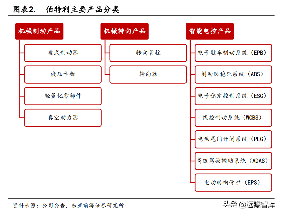 机械制动产品主要包括盘式制动器、液压卡钳、轻量化零部件、真空助力器;机械转向产品主要包括转向管柱、转向器等;智能电控产品主要包括电子驻车制动系统(EPB)、制动防抱死系统(ABS)、电子稳定控制系统(ESC)、线控制动系统(WCBS)、电动尾门开闭系统(PLG)、高级驾驶辅助系统(ADAS)、电动转向管柱(EPS)等。