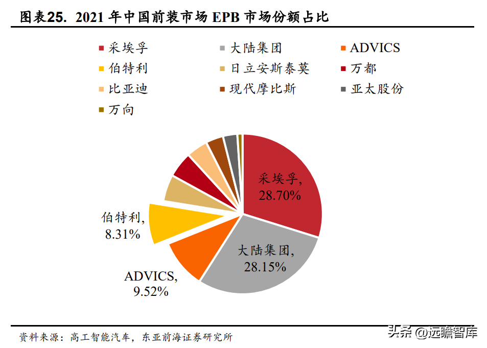 2021 年中国市场(不含进出口)乘用车新车前装标配搭载 EPB 上险量为 1594.04 万辆,前装搭载率为 78.15%。采埃孚、大陆集团与 ADVICS 位列市场份额前三,市占率分别为 28.70%、28.15%、9.52%,伯特利以搭载 132.42 万辆,8.31%市占率位列本土供应商之首。